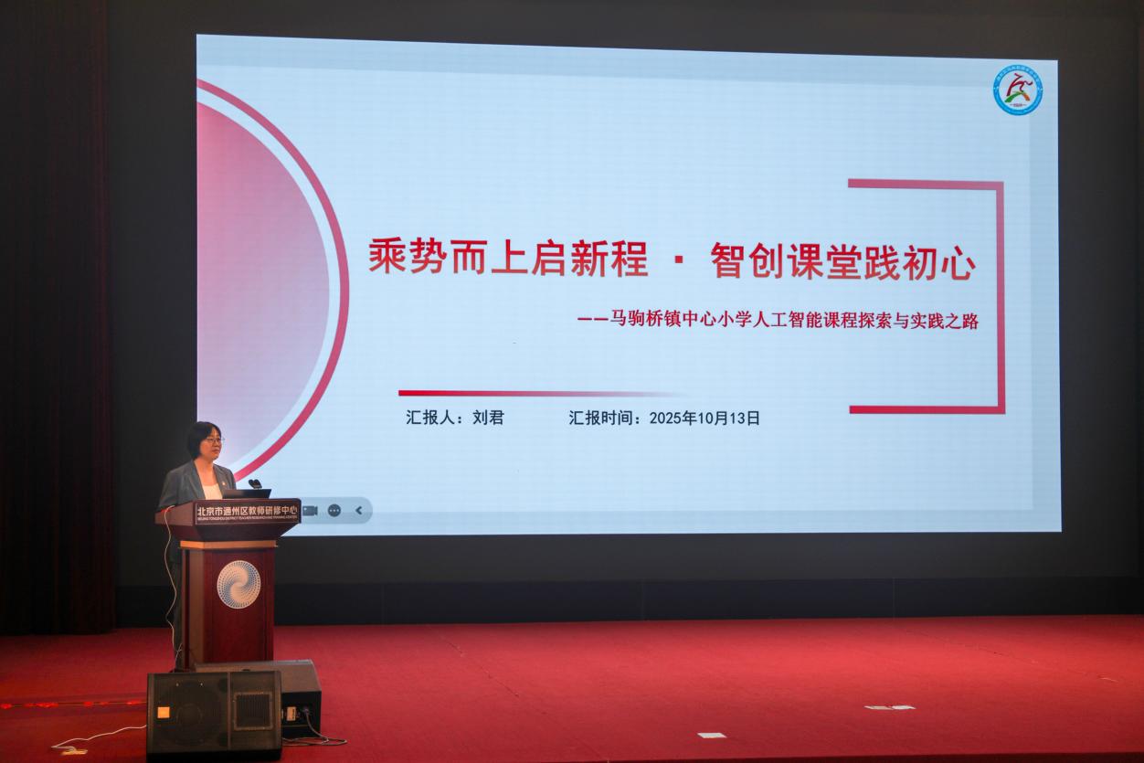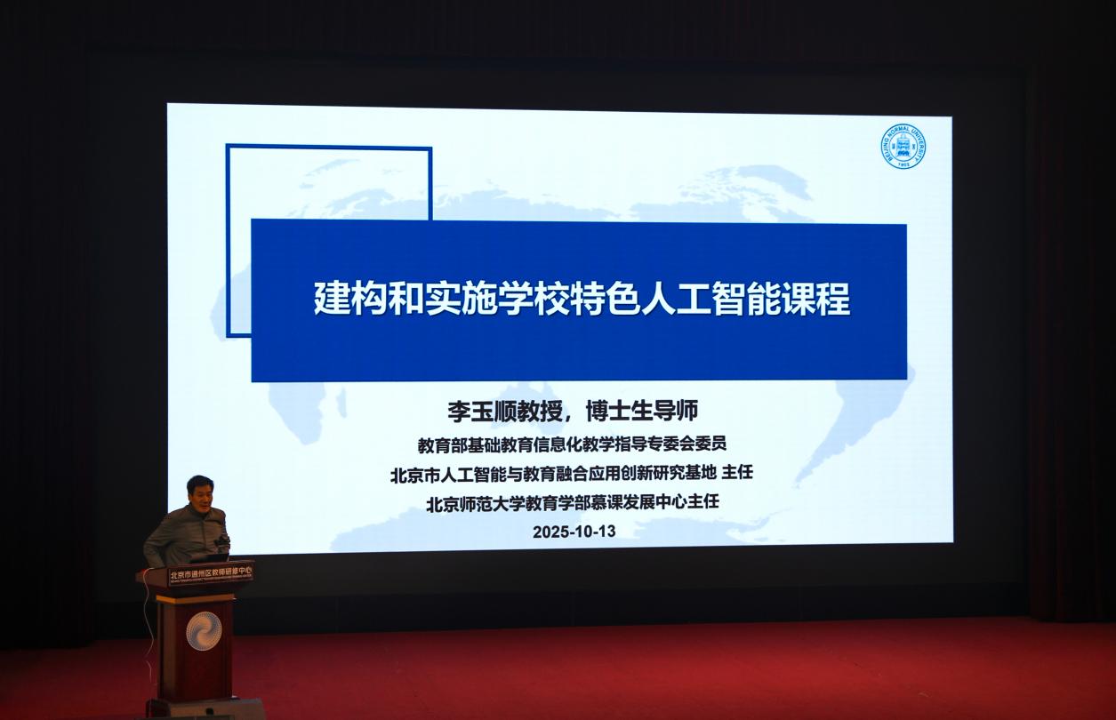 10月13日,通州区宣讲活动在区教师研修中心举行。北京市教委基础教育二处滕飞回顾了在国家政策背景下北京市出台中小学人工智能教育工作方案和课程纲要的历程,她指出人工智能中小学课程的定位“面向人人、面向整体、面向实践”,旨在推动人工智能教育从“兴趣拓展”迈向“必修通识”,深刻体现了首都教育在智能时代背景下对育人模式的前瞻布局与系统重构。她结合课程开设方式、分学段教学重点、安全伦理要求和市级资源储备、支撑平台建设对课程实施要求和资源保障体系进行了详细说明。
