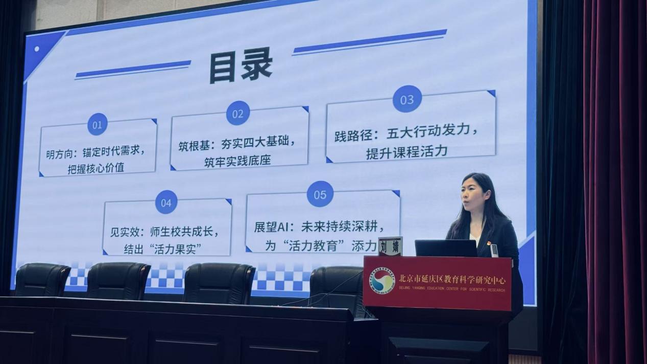 北京景山学校远洋分校教研组长、市骨干教师路宁宁基于所在学校信息科组的实践经验,进行了主题为《中小学人工智能通识课程探索与实践》的分享。她展示了基于学校办学理念的信息科技课程体系,并详细介绍了课程的建设历程、课程管理机制和校本资源库建设情况。结合教学案例她介绍了课程实施中的“教什么”“谁来教”“怎么教”和“教得怎样”等关键问题解决办法和经验,为顺义区学校的课程实施提供了可借鉴做法。顺义区仁和学校化学教师解丁欣围绕AI赋能学校特色发展,介绍了顺义区大模型的建设及学校教学应用情况。