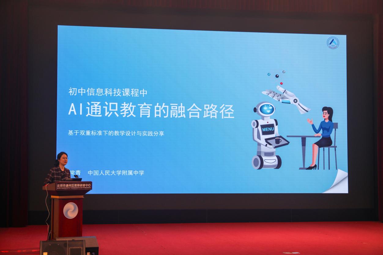 通州区马驹桥中心小学、海淀区人大附中的信息科技教师刘君、常青和通州区潞河中学的信息技术教师崔长华立足所在学校的人工智能通识课开课经历分别介绍了小学、初中和高中阶段的实践和探索经验。三位教师详细介绍了人工智能通识课与信息课程的融合路径,并通过案例分享了融合国家课标和地方课标双重标准下的教学设计和教学实施方案,为通州区不同阶段教师课程开设启发了思路。