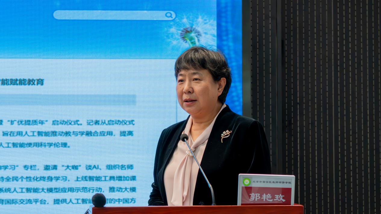 北京市中小学人工智能教育工作专家委员会秘书长、北京师范大学教育技术学院副院长卢宇为参会干部与教师梳理人工智能的基本概念、核心要素及发展形势。通过系统的理论讲解,帮助参会干部教师建立对人工智能学科的科学认知,明确生成式人工智能在教育领域的应用逻辑与边界,为后续开展教学工作夯实理论基础。