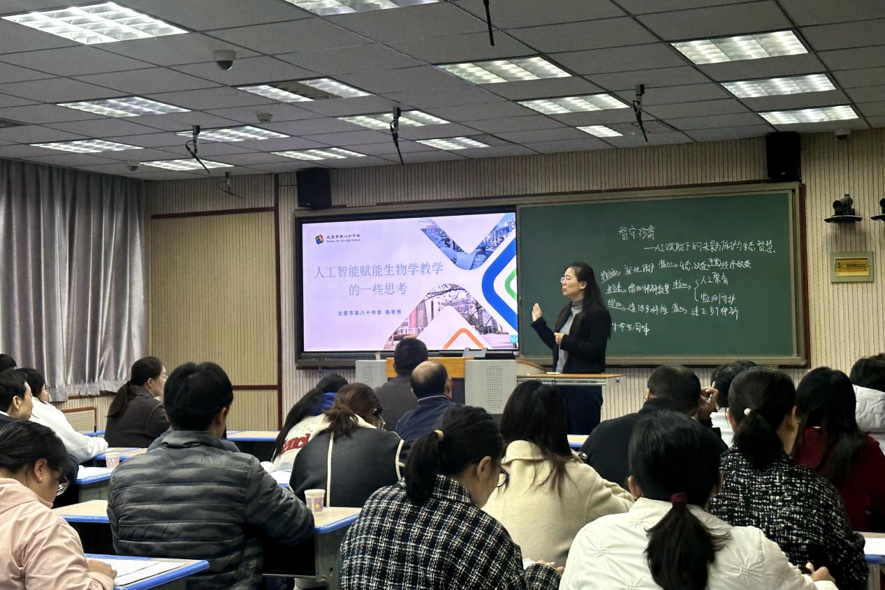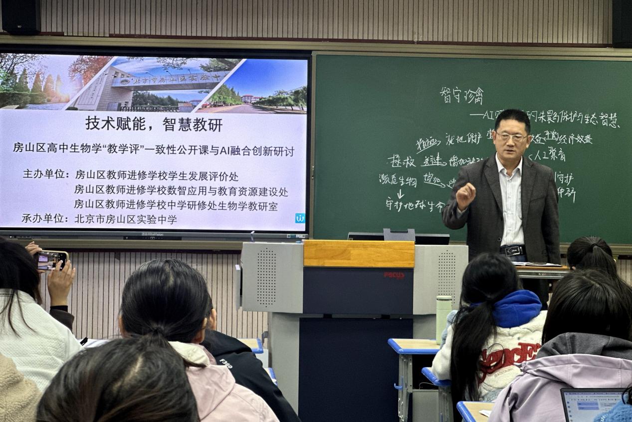 10月21日,“技术赋能 智慧教研”——房山区高中生物“教学评”一致性公开课与AI融合创新研讨会在房山区实验中学举行。北京八十中副校长姚亭秀,房山区教师进修学校中学研修处生物学科教研员、学生发展评价处教研员、数智应用与教育资源建设处教研员,房山区实验中学生物学科教研组成员,北京师范大学未来教育高精尖创新中心学科教育实验室项目组成员等参与活动。