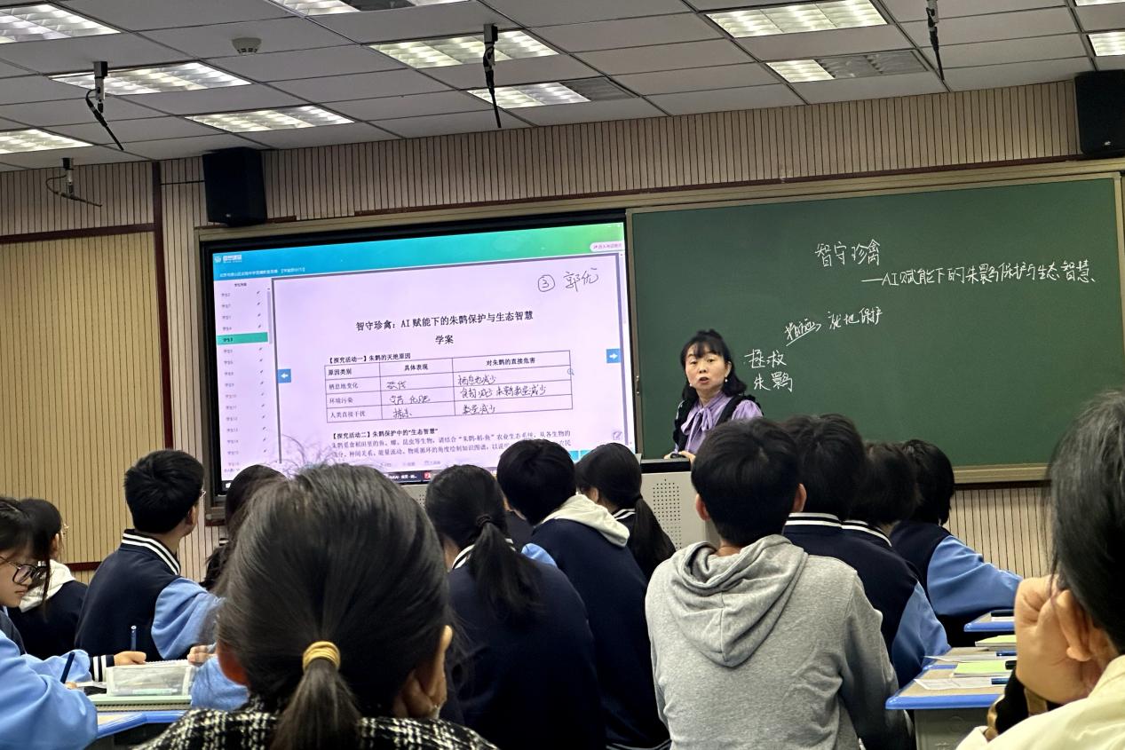 房山区实验中学教师温国蕾的 “智守珍禽:AI 赋能下的朱鹮保护与生态智慧”生物课十分精彩。她围绕朱鹮保护展开教学,通过展示相关资料以及趣味游戏,引导学生思考如何增加朱鹮种群数量,讲解了人随鸟动、人工繁育、野外放飞等保护举措。同时,借助 AI 技术辅助,以直观的图表、流程等形式,呈现朱鹮保护与生态智慧的关联,让学生深入了解朱鹮保护的科学方法与生态意义,激发了学生对生物保护的兴趣与思考。