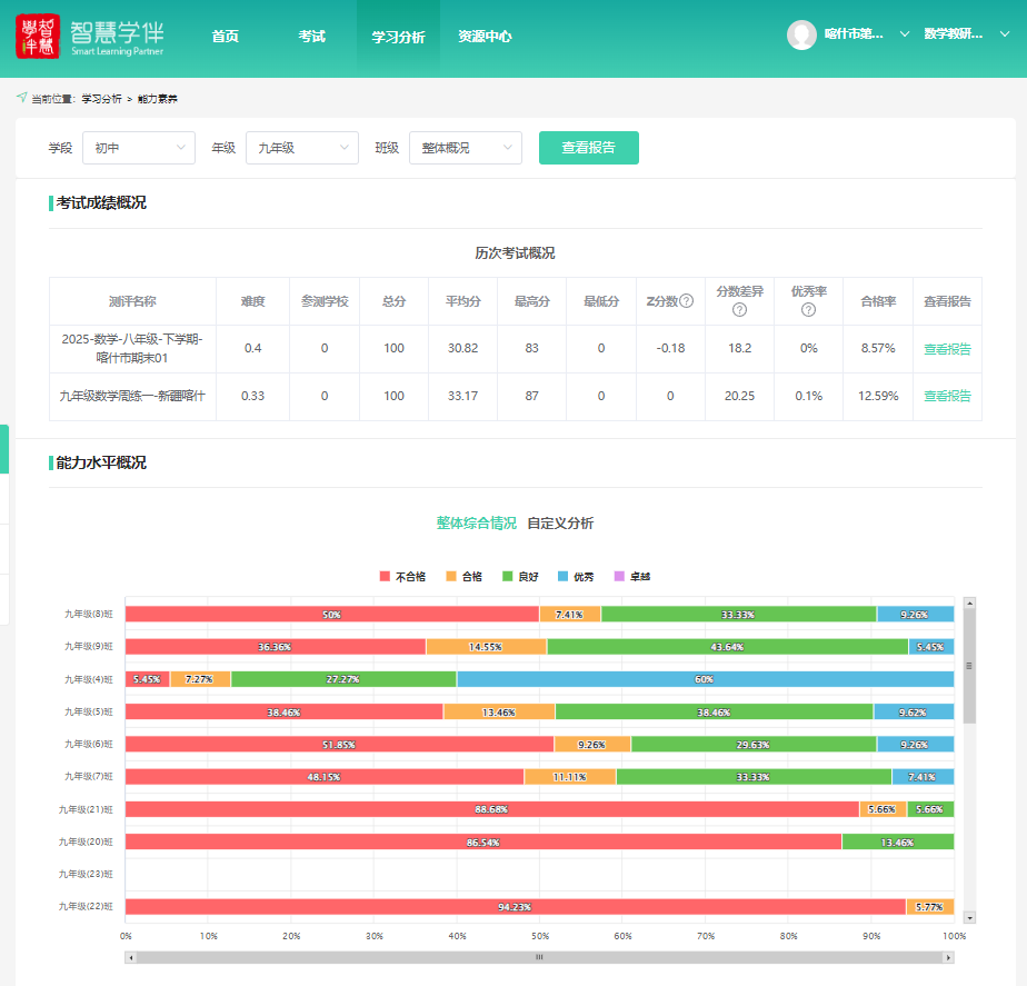 为解决喀什市学校存在的“评价维度单一、数据利用不足”问题,秉持“数据驱动、智能赋能、精准诊断、靶向优化”的核心理念,北师大项目组引入“智慧学伴”数字化评价平台,构建以课标为基础、以学科能力与核心素养为载体的全维度质量评价体系,为学校教学改进提供科学依据。