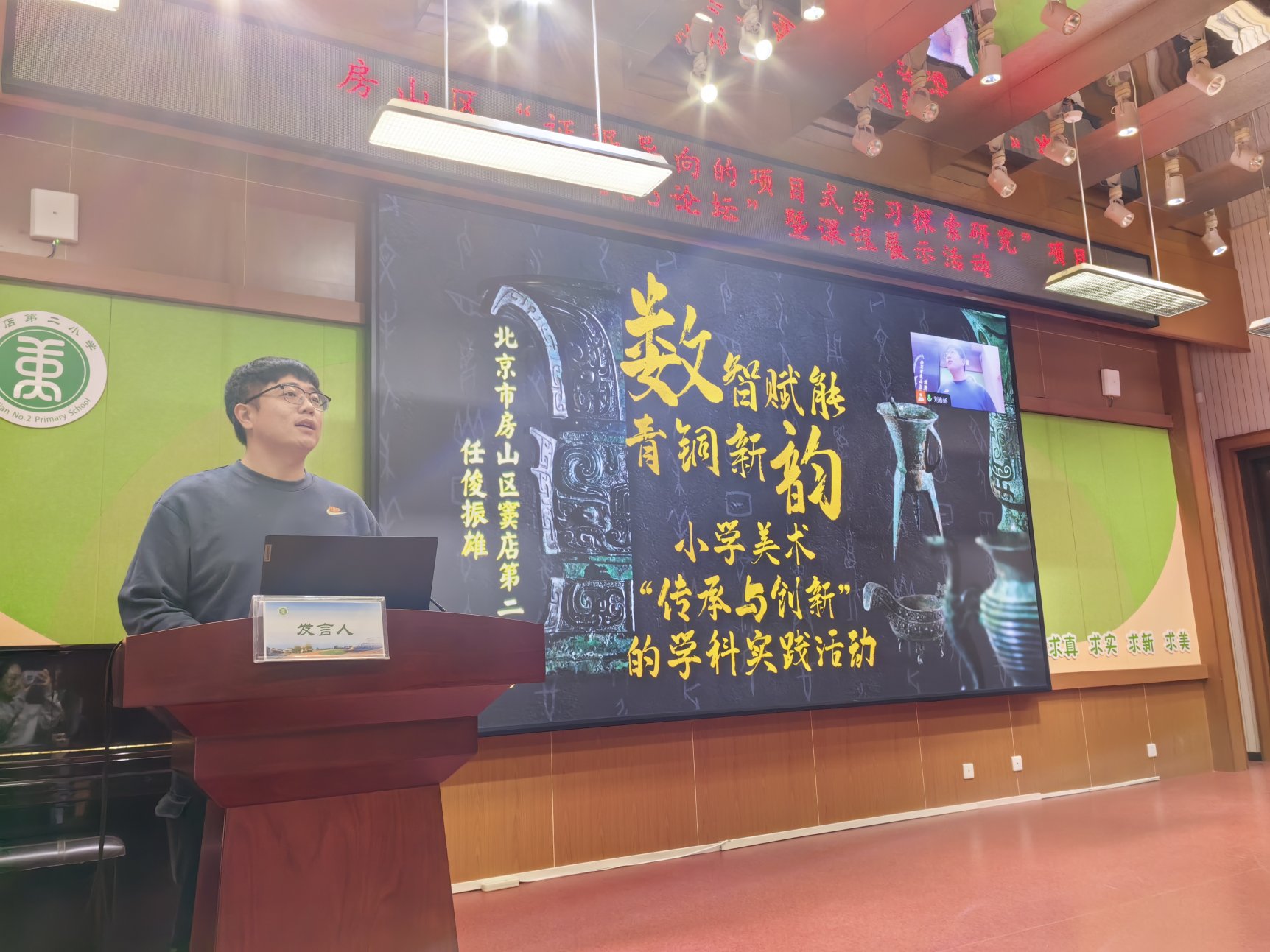 窦店第二小学教师任俊振雄开展《古韵新绎:数智赋能下的小学青铜美学应用实践》说课。他表示,本课程以“青铜文化传承+人工智能技术应用”为核心,面向四年级学生开展“设计青铜风格运动壶”项目化学习。课程紧扣艺术课标,融合人美版教材内容,依托地域青铜文化资源,构建跨学科教学模式。学生不仅深化了对青铜文化的理解,更在真实情境中提升了审美感知、艺术表现与创意实践能力,实现文化基因的现代转译。
