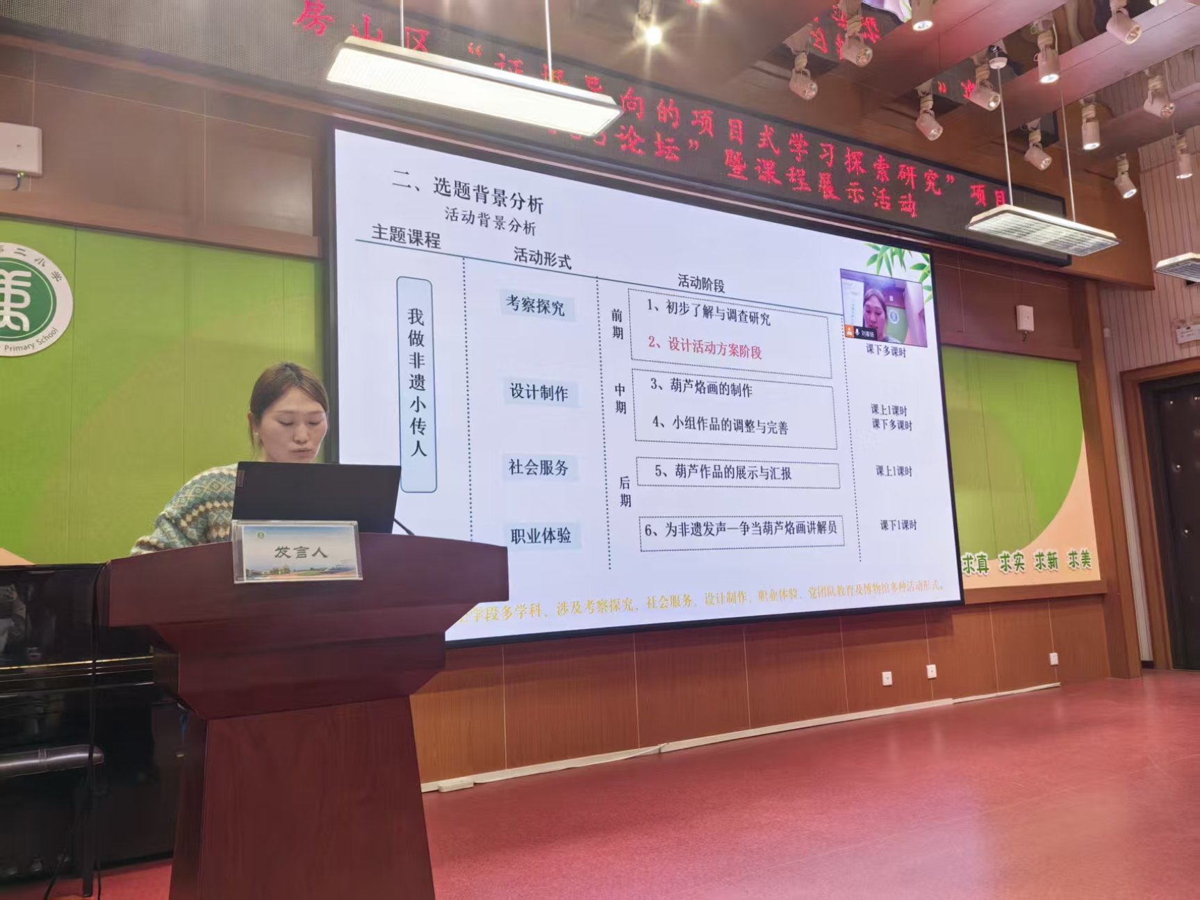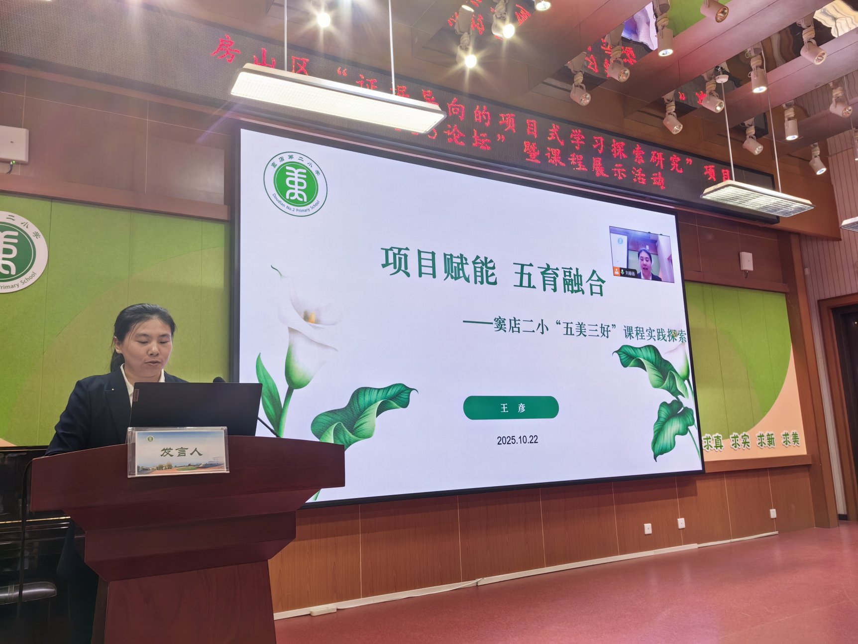 窦店第二小学教学主任王彦分享《项目赋能五育融合:窦店二小“五美三好”课程实践探索》。她表示,面对“双减”背景,学校以“原色育人”为理念,构建“五美三好”课程体系,推动五育融合。“五美”聚焦德美、智美、艺美、劳美、健美素养目标,“三好”贯通课堂、课间、课后三大场景。学校通过开展项目式学习与跨学科实践等形式,实现知识传递向素养培育的转型。学生从被动接受转为主动探究,教师成长为课程开发者,学校形成跨学科教研机制。未来将深化数智赋能,构建资源共享平台,培养具有文化认同、创新精神与社会责任的至美少年。