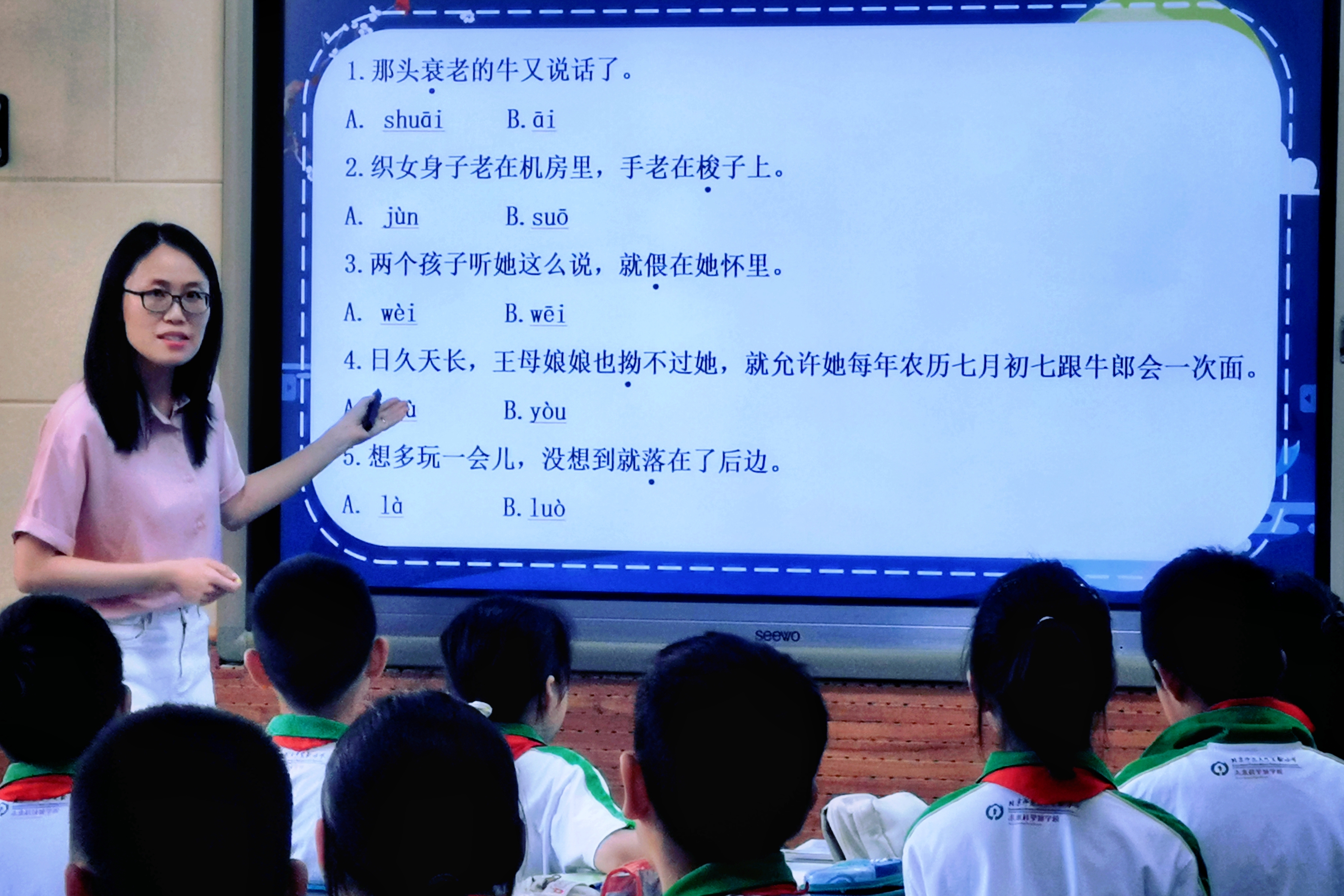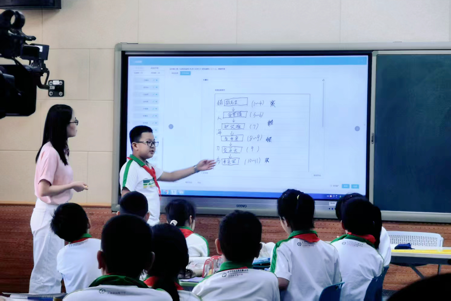 活动分为教学展示和交流研讨两个环节。在教学展示中,北京师范大学实验小学未来科技城学校语文教师李文轩和项目组特邀的马池口中心小学语文教师李静,分别执教了五年级上册第三单元民间故事单元的导读课,以同课异构的方式呈现了精彩的教学实践。两位教师均能从大单元整体视角出发,以单元任务驱动学习。同时,借助点阵笔与三余阅读平台的投票答题功能,高效扫除了字词障碍。通过展示民间故事多样的传播形式,激发学生学习民间故事、阅读民间故事的兴趣。李文轩着重引导学生初步感知“创造性复述”的方法,并通过摘选民间故事内容,让学生初步体会民间故事所承载的人们对美好生活的向往。李静通过故事山、情节链等支架梳理故事情节,进而初步了解民间故事的特点,激发学生阅读民间故事的兴趣。